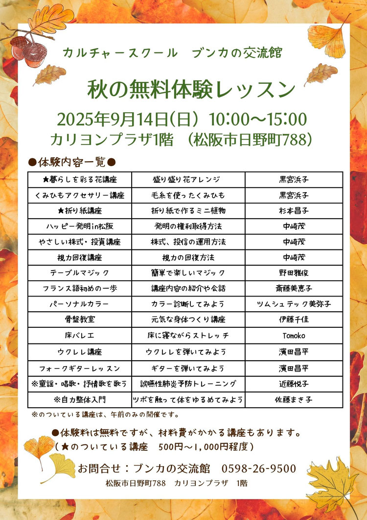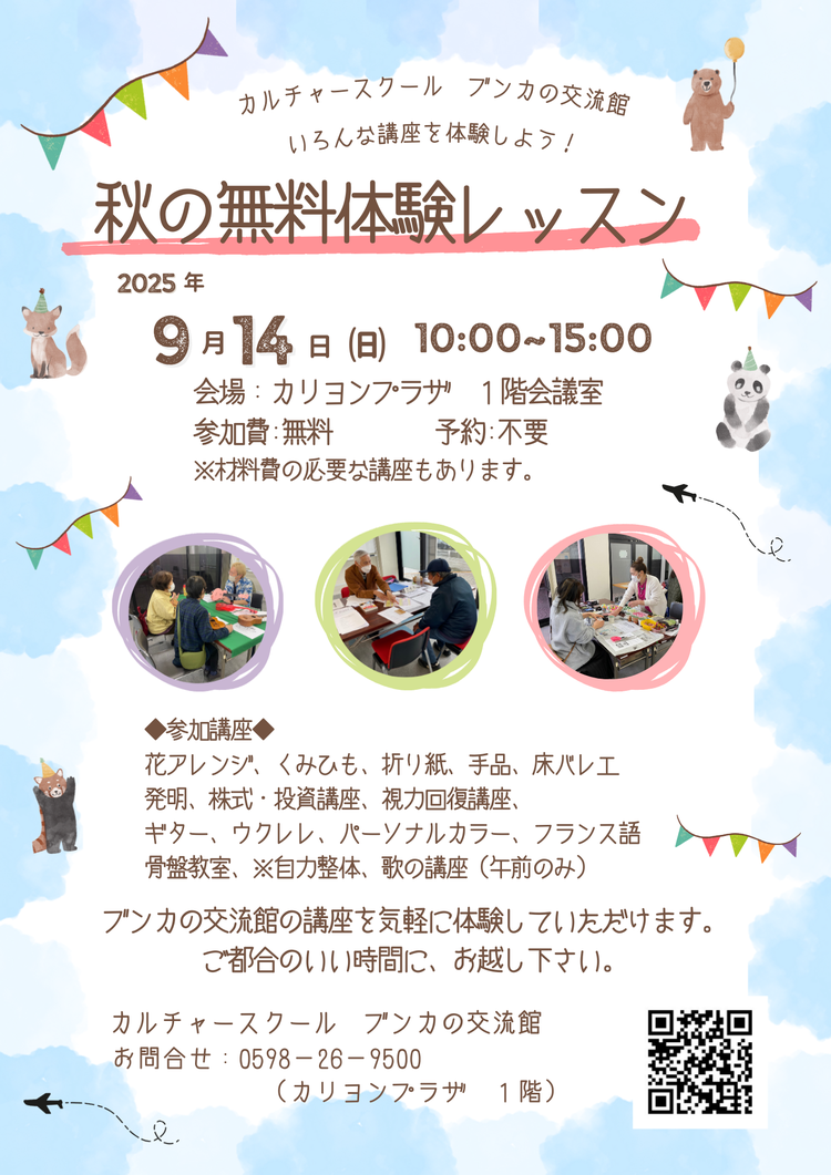 秋の体験レッスンに、参加してくださる講座をご案内します。