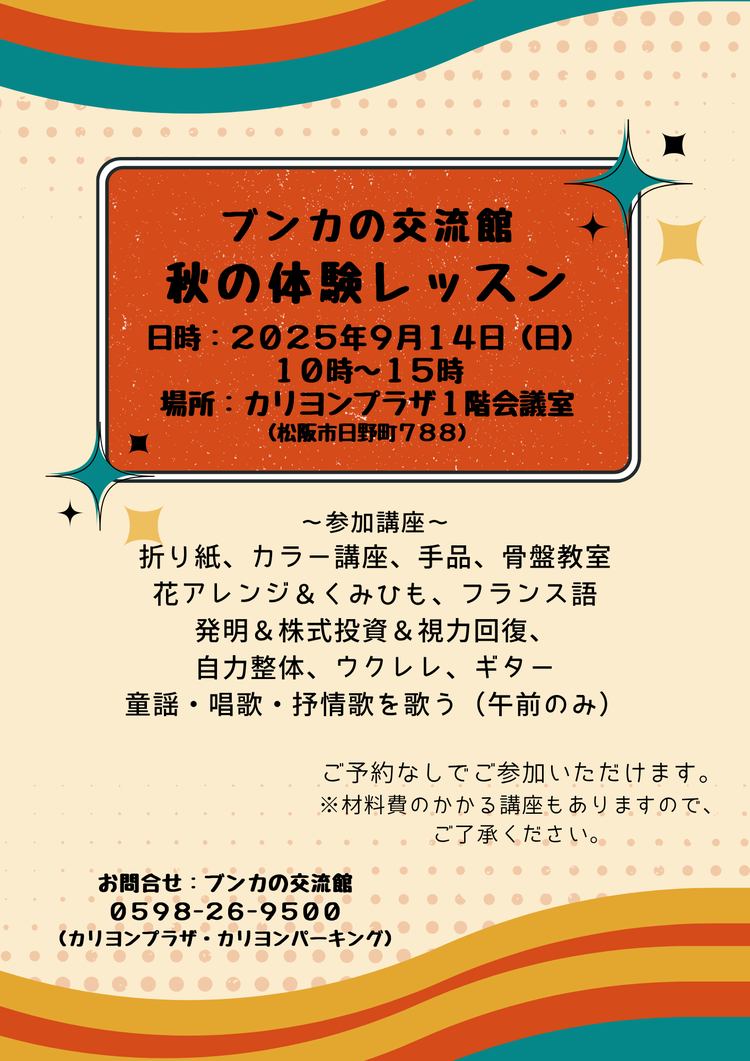 暮らしを彩る花講座、くみひもアクセサリー講座、テーブルマジック、やさしい株式•投資講座、ハッピー発明in松阪、折り紙講座、Yes!英検5級(紹介・受講申込書)、フランス語 初めの一歩(講座紹介)、誰でも弾けるやさしいギター•初心者のためのギター講座、ウクレレ全講座、パーソナルカラーレッスン、誰でもなれる姿勢美人、ゆるむ・やわらぐ自力整体、歪みを直せば若返る!骨盤教室 他